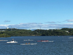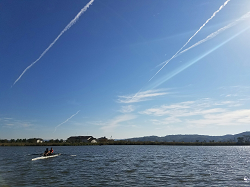 ↑水上の立つのは毎度のことです          ↑飛行機雲がきれいな日でした!今から1000mレースメニューです