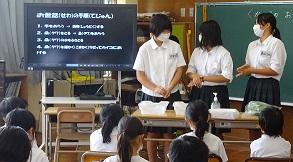 本校の生徒たちがお世話の実演をしました。「手を消毒してからお世話をします。」