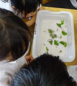 桑の葉を食べる蚕の様子をじっくりと観察する児童のみなさん。