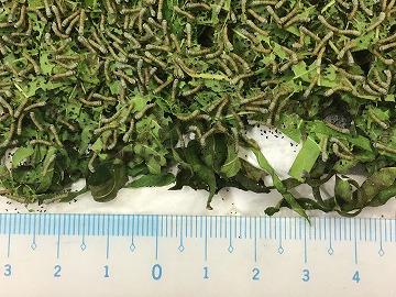 桑の葉を食べる勢いも増し、現在は一食につき10枚前後の新鮮な桑の葉(桑の葉の先端から3~4枚目の葉)を与えています。