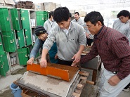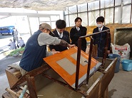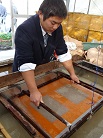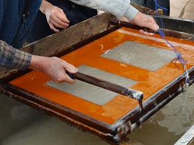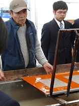 〇生徒たちは慣れない手つきながらも、「すげた」を操り、和紙を漉(す)いて卒業証書の台紙を製作していました。今から完成が楽しみです。斎藤様、奥様ありがとうございました。