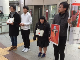 〇募金は、星稜大学学生奉仕団のお二人(写真左側)、日本赤十字社石川支部の神野さん(写真右側)と本校生徒で行いました。場所は金沢駅東口です。