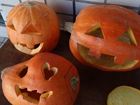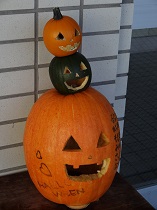 明日(10月30日)の文化祭を前にして、生徒玄関にはハロウィンカボチャが置かれました。本校の花と緑(園芸)系列の生徒がカボチャを育て、ハロウィン用に工作したものです。文化祭や学校公開等でお越しの際に是非ご覧ください。