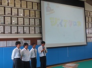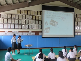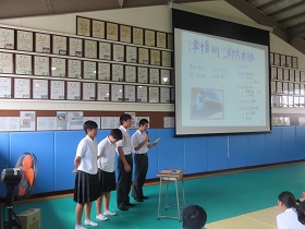 〇会場は本校の格技場です。柔道の表彰状がたくさんある中での発表でした。