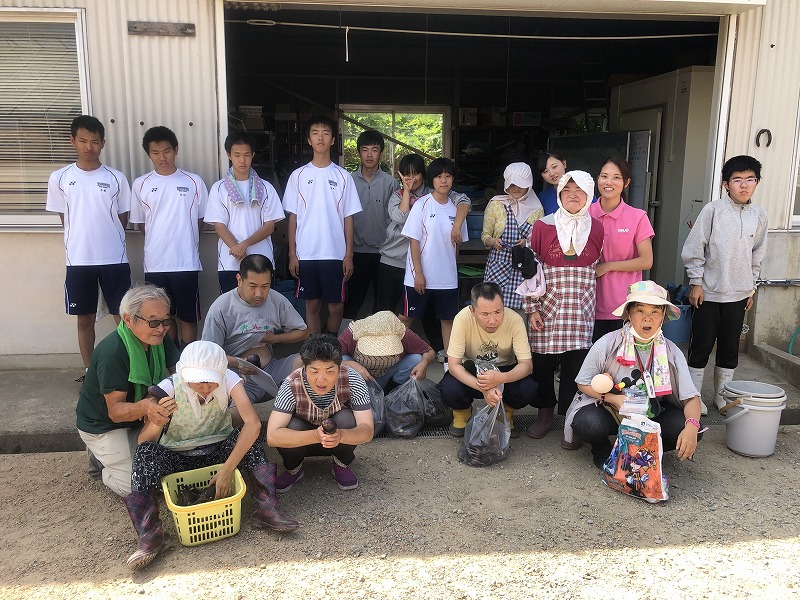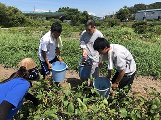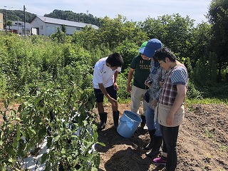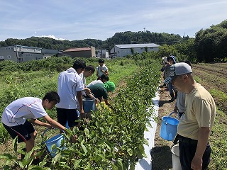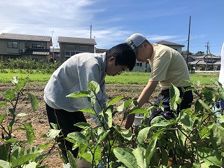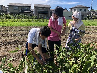 8月9日に「はぎの郷」の方々と、食農・環境教育プログラム(ナスの収穫)を行いました。交流は園芸部の生徒が行いました。2年前の卒業生が、大学の夏休みの実習で「はぎの郷」に来ていたようで、久しぶりに本校の農場で一緒に活動を行いました。