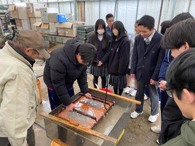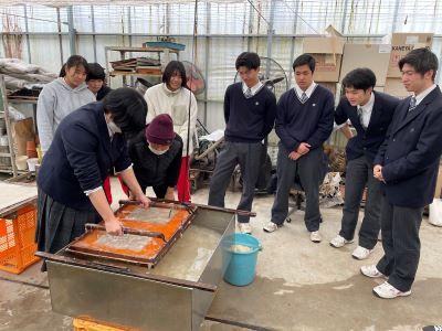 本校3年生が、「こども森の恵み推進事業」として『楮和紙(二俣和紙)づくり』を体験しました。過去8回実施しており、今年で9回目となります。石川県の伝統工芸である『加賀二俣和紙』に関しての講義および実習を通して興味関心をもち理解を深めています。そして、3年生全員が二俣和紙の紙漉き(かみすき)に挑戦し高校生活の集大成である、卒業証書を自分の手で漉き、正真正銘『世界で一つだけの卒業証書』をつくりあげています。
