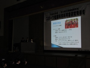本校スポーツ科学科3年生が取り組む研究の全体発表会がありました。