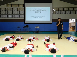 体の柔軟性を高めてパフォーマンスの向上やけがをしにくい体づくりを学ぶ実習を行いました。