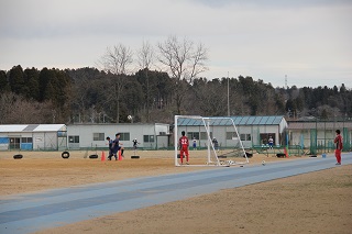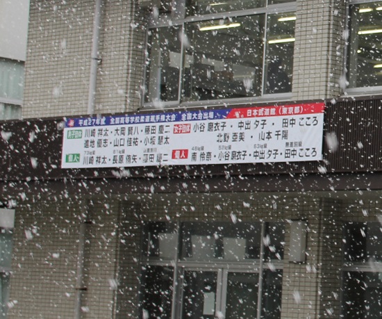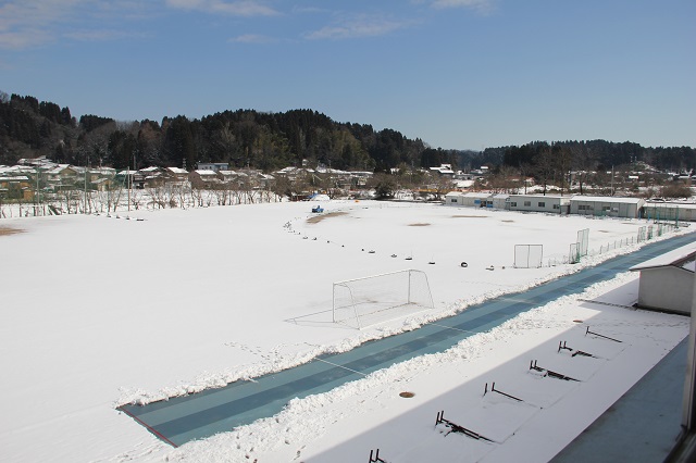 寒がもどり、雪が積もりましたが、陸上部は練習のためにタータン上の雪をどかし、練習をしています。今日はきれいに晴れて残った雪も溶かしてくれそうです。