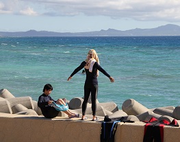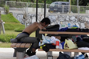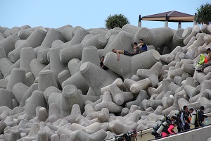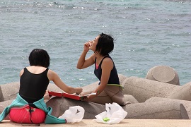 日陰を見つけ、うつらうつらする男子、テトラポットの上で甲羅干しをする男子、それに対比し、女子はじっとしていません。