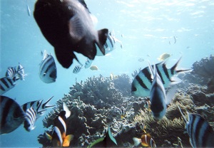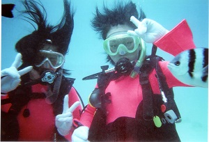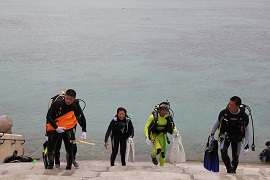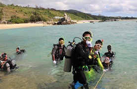 穏やかな海にボンベを背負って入っていきます。足元にはかわいい魚がいっぱいいます。