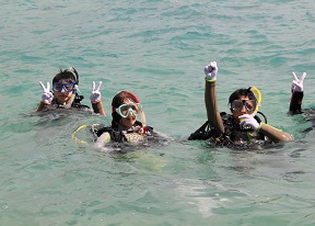 昼食が終わると、女子は浜辺でサンゴや貝殻取りに夢中です。
