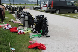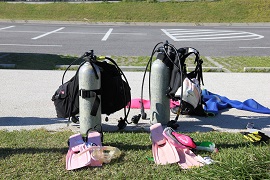 実習が終わるとボンベをおろし、太陽にあたって水着を乾かします。