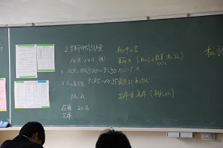 教室の前には本日の時間割と試験に関する禁止事項が書かれています。津高の木々にも鮮やかな色がつき始めました。