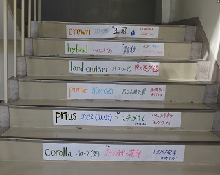 廊下には先日の1年生の職場体験のまとめ、階段には校長の力作(?)である英単語票が貼ってあります。今月は車シリーズです。