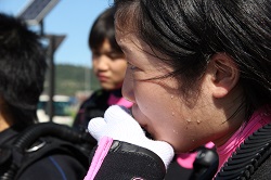 沖に出て30分で一度海から上がり、いよいよボンベを装着します。