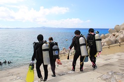 今度はボンベを装着し、海へ向かいます。20キロほどあるボンベを背負うのは体力が要ります。