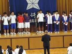 インターハイの結果報告では5位に入賞した柔道部長原万宗君(60kg)、上野翔平君(100kg超級)のインタビューもありました。インターハイでの入賞は、本人の血の出るような努力と、よき仲間そしてよき指導者に巡り会えた結果だと思います。