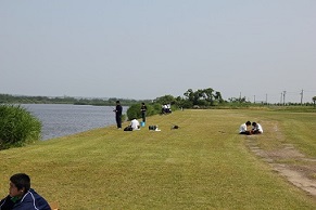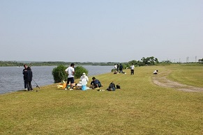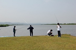 園芸部、JRC,ソフトテニス部、その他有志は河北潟漕艇場近辺で朝から外来魚駆除のための釣りを行っています。