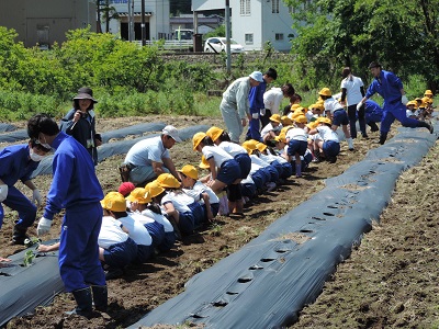 本日は午前中に近隣の保育園、小学校の園児児童が津幡高校の農場を訪れ、「サツマイモとポップコーンの苗の植え付け体験」をしました。本校生徒がお手本を示し、それを上手に見習って苗の植え付が行われました。秋の収穫が楽しみです。