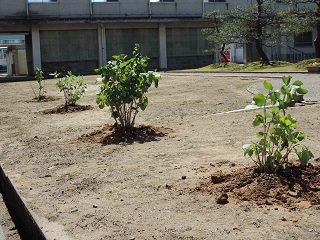 また、中庭にはアジサイとフヨウの木が植えられました。まだまだ小さいですが、これから梅雨になりしっかりと根を張り、大きくなっていきます。 これから中庭の木は少しずつ増やしていく予定です。来年には教室から中庭を見下ろせば花いっぱいになっているかも知れません。
