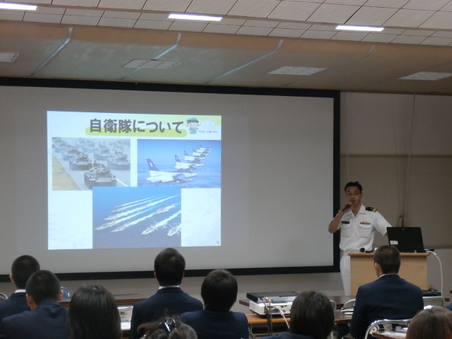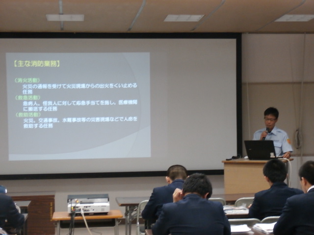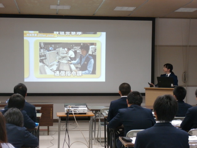 消防、警察、自衛隊の方々に実際に学校にきていただき、直接に試験の概要や業務内容をパワーポイントやDVDを使って説明していただきました。