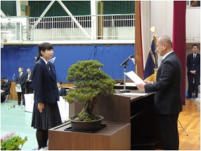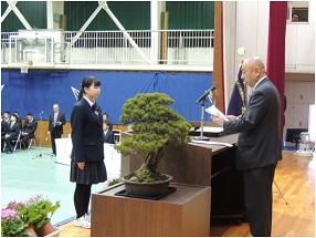 卒業記念品は、生徒を代表し高田千椿(35H)さんが受け取りました。