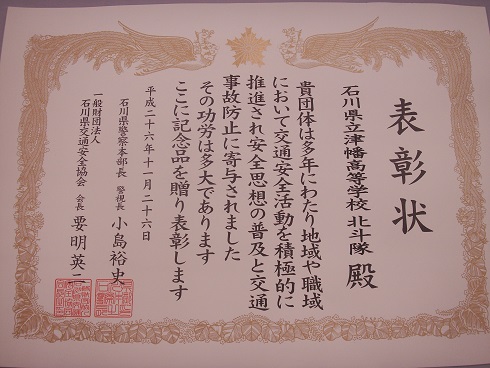 石川県交通安全県民大会で長年の生徒による交通安全への取組に対し、県から表彰を受けました。