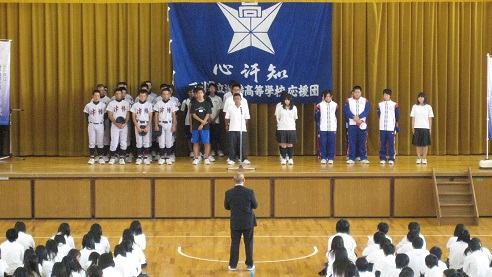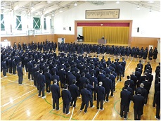 初めに全校生徒で校歌斉唱し、次に校長からの訓話が行われました。