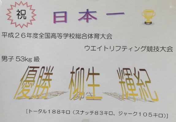 本校事務室前に、ウェイトリフティング優勝の柳生君を讃えるポスターが貼られました。