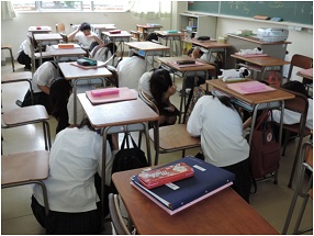 サイレンとともに「訓練!地震発生!」の放送が入り、生徒は全員机の下に身を隠しました。