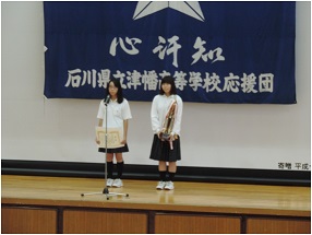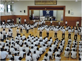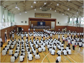 北信越や各種大会の報告会が行われた後、全国高校総体の壮行式が行われました。出場部活は、女子バスケットボール部、柔道、ボート、