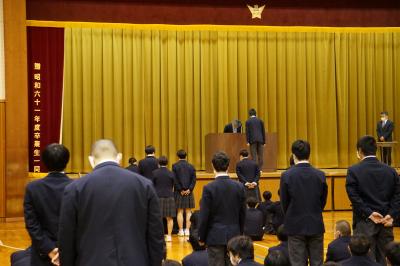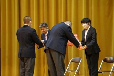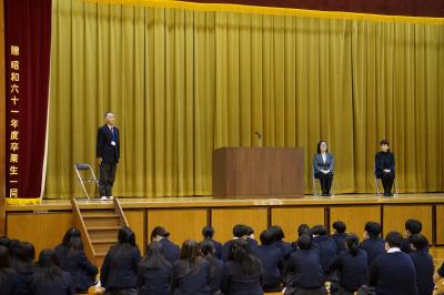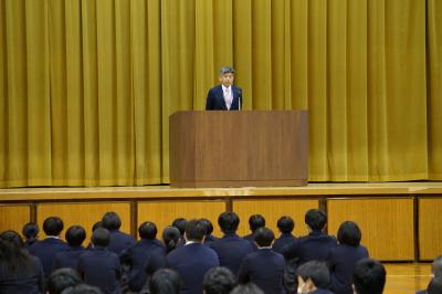 1ヵ年皆勤賞受賞者 終業式で式辞を述べる山本校長