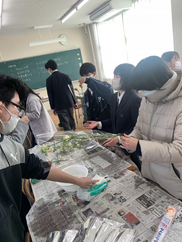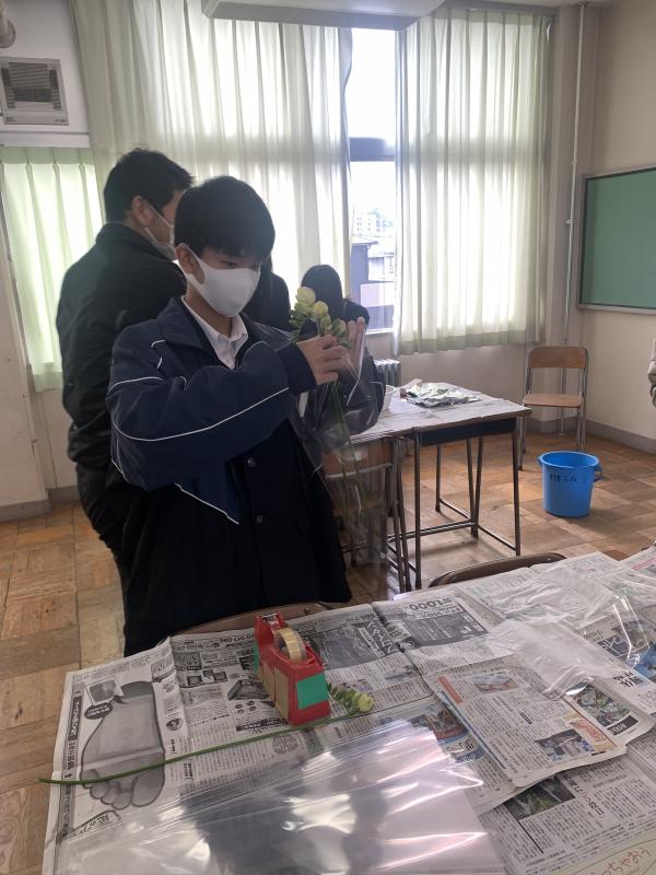 在校生から卒業生への感謝の気持ちを込めて贈るエアリーフローラのラッピングを行いました。