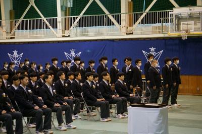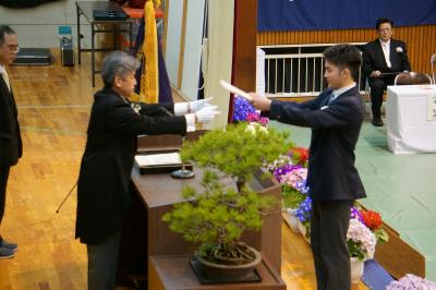 同窓会入会式では、3年生は向正則同窓会長より歓迎の言葉と卒業記念品をいただきました。