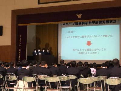 本日の発表会は学年内で選ばれた代表5グループによる、スポーツ健康科学科全体への発表となりました。