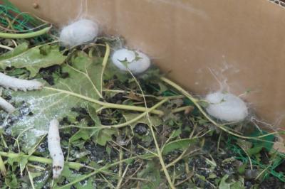 すでにダンボールの中で繭になっている蚕もいました。
