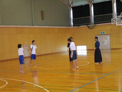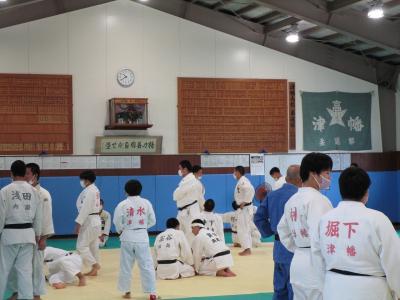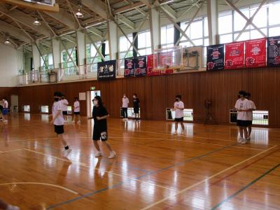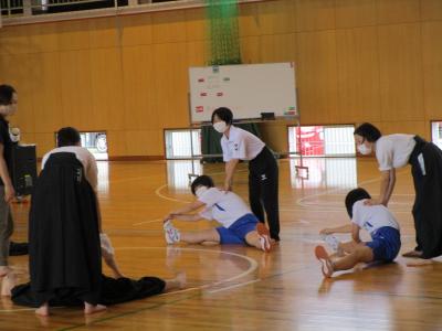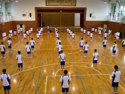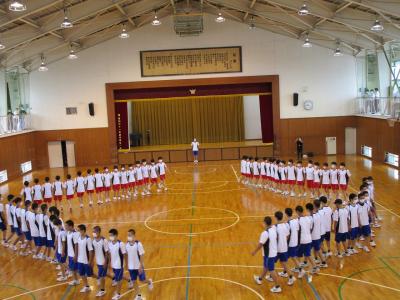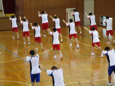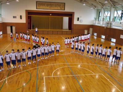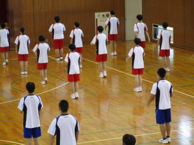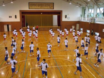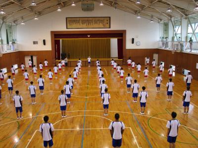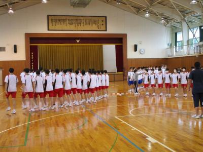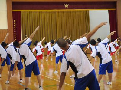 明日参加される中学生、保護者にお披露目する「集団行動」「津高体操」のリハーサルを行いました。