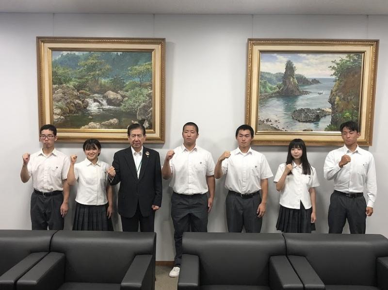 7月19日(火)15:30より津幡町長表敬訪問で令和4年度全国高等学校総合体育大会・総合文化祭への出場報告ならびに決意表明をを各部の代表者がしました。矢田町長からは「体調を万全にし大会に臨み、がんばってきてください」とg激励のお言葉をいただきました。これから始まる全国大会で良い結果を出せるよう頑張ってきます。