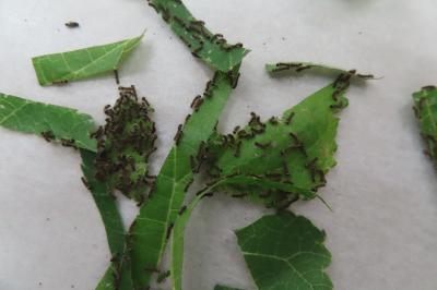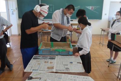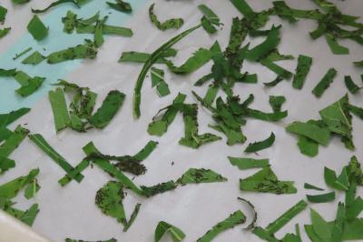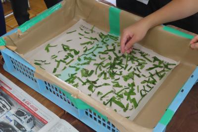 まずは蚕の育成のため、部屋のセッティングをしました。その後、桑の葉を採取し与えました。