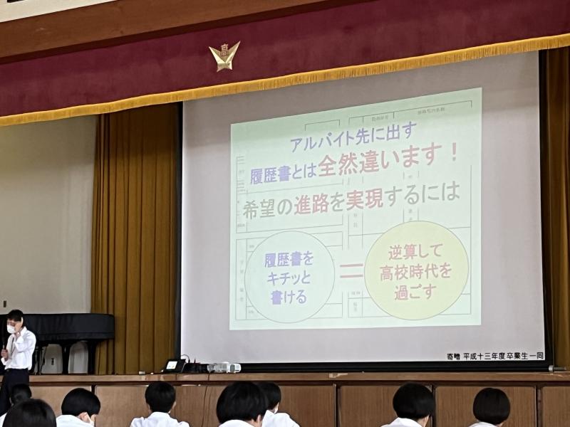 1年生のうちから卒業後の進路を考えておくだけで、視野が広がり、普段の見える景色が変わってくるという言葉が印象的でした。進路の選択肢や、履歴書の書き方なども教えていただきました。