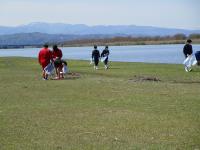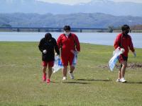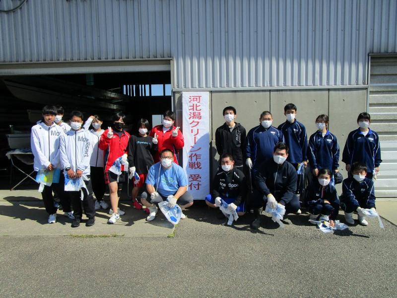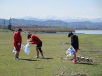 石川県漕艇場周辺を河北潟に沿って資源ゴミを回収します。桜はもう散っていましたが、心地よい天気で、白山連峰を背に、左の河北潟で練習する金沢大学漕艇部を見ながら作業を行いました。今回の「クリーン作戦」には、柔道部、ウエイト部、ボート部、農蚕部から17名が参加してくれました。