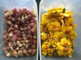左から、センニチコウ、マリーゴールド、アジサイ、オレンジ。
