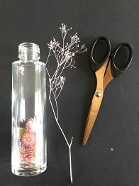 ガラス瓶にドライフラワーを入れていきます。