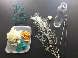 必要なものは、ガラス瓶、ハーバリウムオイル(シリコンオイル)、ドライフラワー(プリザーブドフラワーや造花でもいけます)の3点です。