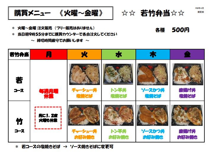 ▶注文は朝9時55分までです。2限目が始まるまでに各自お金を購買まで持ってきてください。