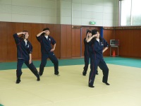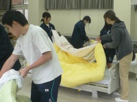 介護役の生徒は四苦八苦しながら要介護者役の生徒に衣服を着せていました。
