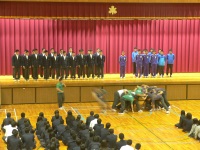 今回は柔道部による趣向を凝らした応援で、応援歌、3・3・7拍子、校歌斉唱以外にも