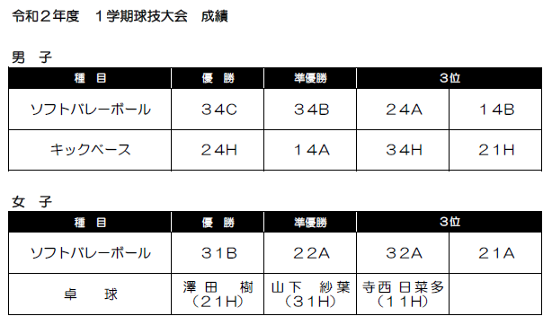 今日は午後から球技大会の決勝が行われました。キックベースボール男子、卓球女子、ソフトバレー男女に分かれて各会場で熱戦が繰り広げられました。キックベースボール男子では24H、ソフトバレー男子は34H、ソフトバレー女子は31H34H混合チームが優勝しました。各学年スポーツ科学コースを擁する4ホームが力を発揮していました。