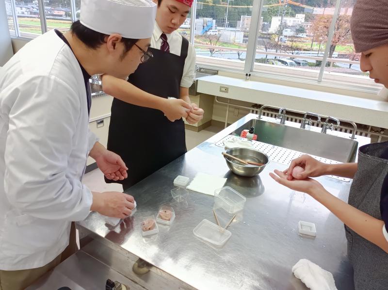 「和の菓ひろの」の店主、廣野純一先生が来校し、上生菓子の練り切りの作り方を教えてくださりました。
